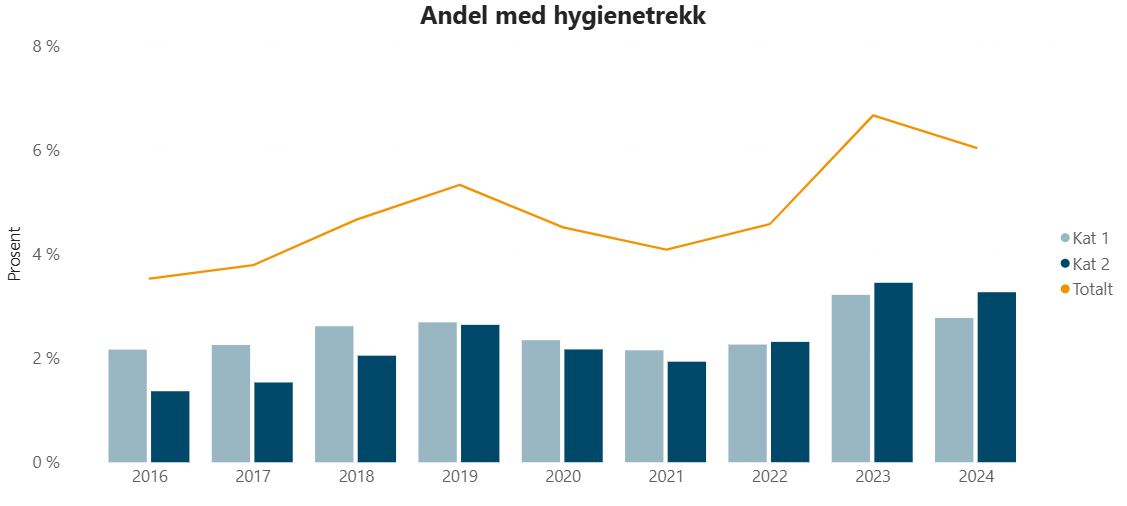 2023 var værmessig et utfordrende år, og noe av nedgangen av skitne dyr i 2024 tilskriver bransjen bedre vær (se figur). Dette viser at utfordringen er sammensatt av mange faktorer, som både bøndene og slakteriene jobber systematisk med.