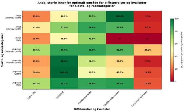 I figuren over ser vi hvordan forskjellige slakte- og rasekategorier treffer på markedets oppfatning av optimale biffstørrelser. Det er ung okse av ekstensive kjøttfe som treffer best, 34% av de nedskårede slaktene er innenfor optimalt område for alle variabler. For slaktekategorien kvige er det intensive kjøttfe som treffer best.