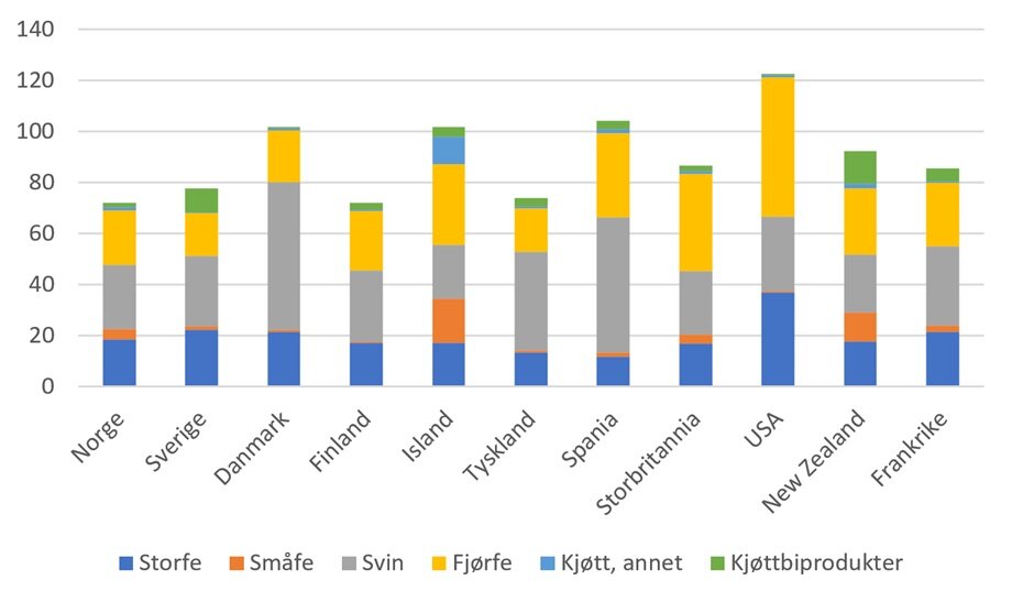 I tillegg til Danmark og Island, er det USA og Spania som har det høyeste kjøttforbruket av landene som er presentert her. Figuren viser at i forhold til andre land det er naturlig å sammenlikne seg med, er forbruket av kjøtt i Norge moderat.